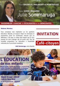 En tant qu’adjointe aux affaires scolaires à Malakoff et ayant exercé le beau métier d’institutrice puis de directrice d’école, je reste très sensible aux questions éducatives. C’est pourquoi je souhaite vous inviter à un café-citoyen avec Julie Sommaruga, députée, le mardi 16 mai à 20h30 au New Mail, 31 rue Eugène Varlin à Malakoff.