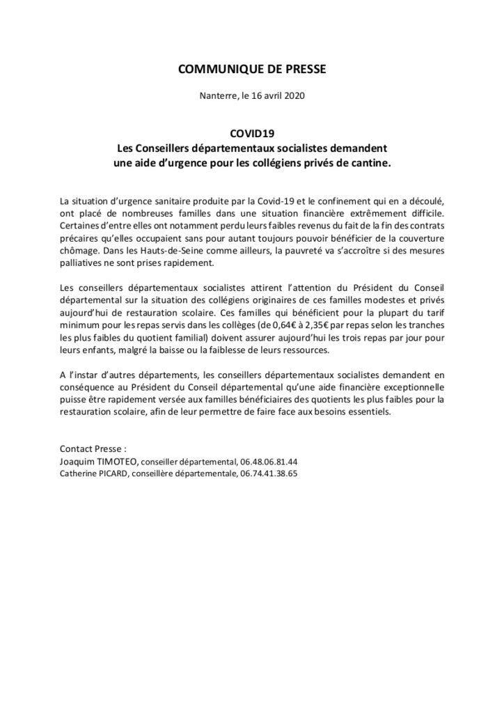 Vos conseillers départementaux socialistes demandent une aide d’urgence pour les collégiens privés de cantine par Catherine Picard · 17 avril 2020 Le communiqué de presse en pdf Partager !
